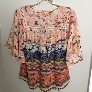Gorgeous print flutter sleeve top from Anthropologie. Beautiful crochet detail and tie with tassel ends. Size xs.