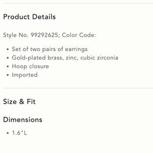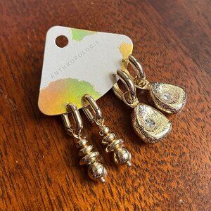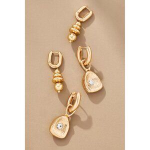 Anthropologie "Metal Huggie Hoop Drop Earrings, Set of 2" made of gold-plated brass, zinc, and cubic zirconia. The two pairs coordinate but have distinct style and shape. Medium size, about 1.5 inches. The pair with the gems are solid metal, so they are somewhat heavy. NWT, removed from original packaging only for photos.