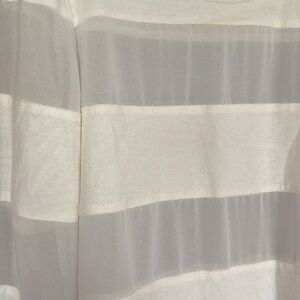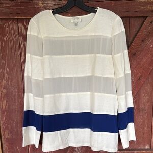 Anthropologie (harlyn) navy/off white sheer crepe and woven block stripe tunic. 100% cotton; contrast 100% polyester. Pullover. Large. Armpit to armpit approximately 21 1/2 inches. Shoulder to hem approximately 25 1/2 inches. Nonsmoking home.