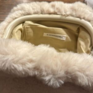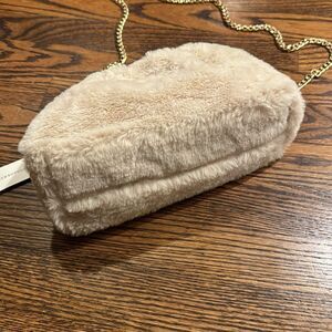 Anthropologie ivory plush faux fur hinge closure removable gold chain strap crossbody/clutch. Inner side pocket. 100% polyester. Lining 100% cotton. Approximately 10 x 6 x4 inches. NWT. Nonsmoking home.