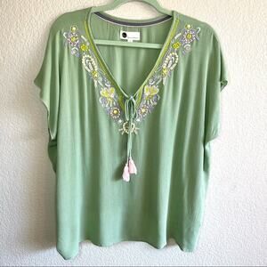 This is an absolutely stunning light green blouse from Floreat by Anthropologie. The blouse is a light green, lightweight, flowy, with embroidered and sequin detail along the neckline and a front tie with pink tassel. It is a size small and in excellent condition!