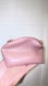 : It is a small, curved pouch likely made of PU or vegan leather, with a zipper closure and a detachable strap. The large opening design provides easy access for makeup and toiletries, making it suitable for travel.