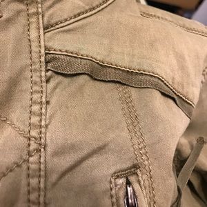 Anthropologie olive green utility style jacket. Front Button closure. Zippered cuffs. Twill tape and stitching detail on jacket. Perfect for dresses or with denim.