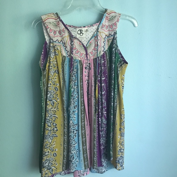 NEVER BEEN WORN. This top has different patterns with an embroidered part around the chest and back. Lots of bright colors but has a very vintage vibe. Size xs but could fit a small.