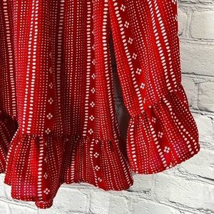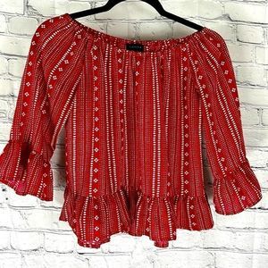 This cute blouse is pre-owned and in excellent condition, featuring a ruffle hemline and ruffles at the sleeve opening. The neck is elastic, and I guess, depending on your frame, you could wear it off the shoulder. The red is a rusty red color.