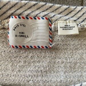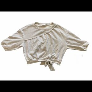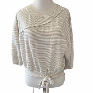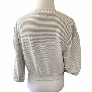 This sweater has so many details! the stripe is changing direction throughout this sweater - horizontal on the body and sleeves, diagonal on the right shoulder with a decorative seam and diagonal on the neckband. The waistband ties into a bow that is functional - there is also a small notch cut out where the bowtie ties. The balloon sleeves are 3/4 length.