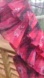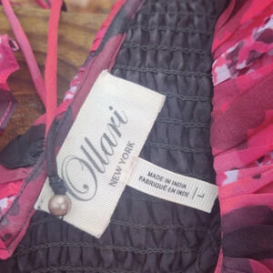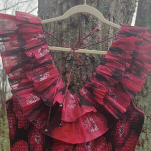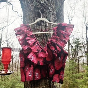 Maroon, black and white smocked top with statement sleeves, we're talking frilled lizard vibes. Worn twice. V neck, beaded tie in back. Polyester, made in India.