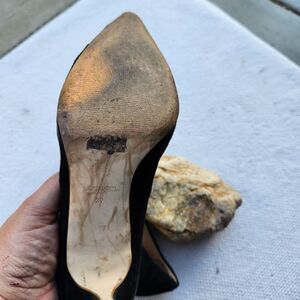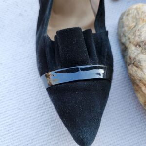 Black velvet ruffled kitten heeled shoes with a patent strap detail. Preloved condition. All sections of interest as well any known flaws have been documented in the photos and noted as thoroughly as possible. if there are no known flaws, none will be noted. Please feel free to ask any questions before purchase 🙂.