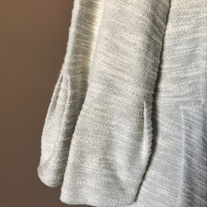 Cropped button down ruffled jacket with 3/4 ruffled sleeve. Color is light gray/ white weave cotton material