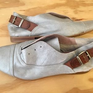 Brand Sixty Seven from Anthropologie silver loafers with brown adjustable buckles on back of shoes. Very comfortable slip on loafers! Leather upper and soles, made in Spain. In excellent condition! European size 37, which is US women's size 6.5/7. Purchased from another posher for a specific outfit, but didn't end up wearing that outfit so don't need them anymore. Otherwise, they're beautiful unique shoes! NO TRADES.
