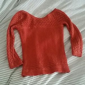 This slightly cropped, 3/4 sleeved orange sweater is pretty and perfect for spring. It is in great condition and has such pretty detail on the neckline in a V that shows off the top of your beautiful back. The stitching is sweet and shows a little skin peeping through on the arms, shoulders and decolletage.