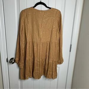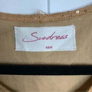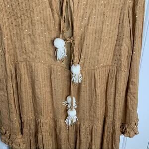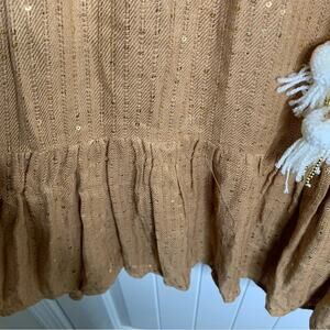 Cotton blend. Fully lined. Dual front self tie closures with drawstring embellishments. Ruffled sleeves. Lurex and sequin embellished fabric.