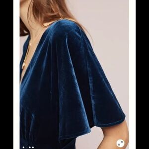 Anthropologie teal velvet jumpsuit with flutter sleeves, wrap top size Medium