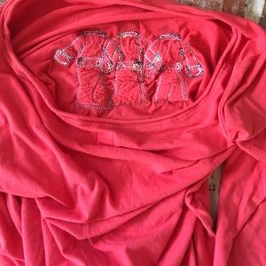 Half sleeve top. The clothing of the ladies on the shirt are made of real cloth. Image of stitching has been posted. Material is peach, 92% cotton and 8% spandex. Feels very thin and light and extra comfortable. Size S.