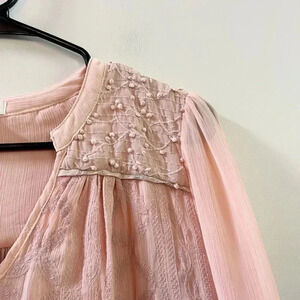 Anthropologie pink embroidered pink blouse. Three quarter sleeves. Size small. Excellent used condition