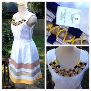 Stunning unique dress! Rope bib necklace detail, peekaboo tulle at the skirt hem. Cotton blend exterior with a textured tweed look. Fully lined. Side zipper. Gold metallic and yellow stripe trim. Fit and flare style. 34" bust, 28" waist. 26.5" body length. Excellent condition. Interior lining has some minor discolorations, possible makeup or tanner? but exterior is clean