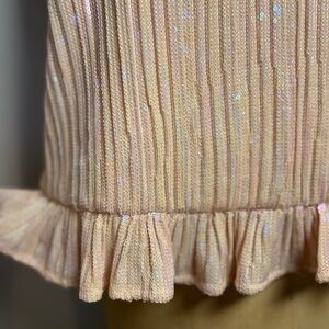 Lovely peach sequin sleeveless top with adjustable straps. Lined. Ruffle detail around bottom