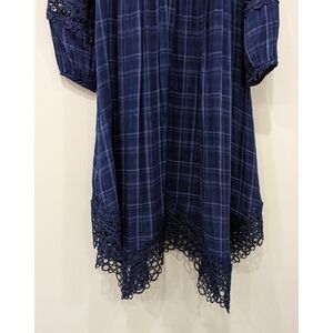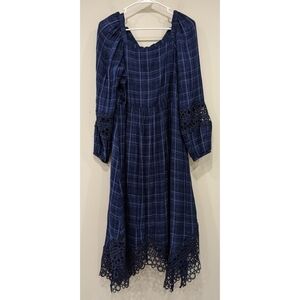 Excellent pre-owned condition. Anthropologie x Akemi + Kin Codie Plaid Eyelet Handkerchief Hem blue dress. Size 6