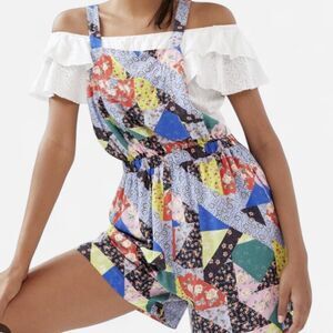 Playful patchwork 🌸 Anthropologie x Corey Lynn Calter short overalls romper. Button strap style with allover vibrant quilt-inspired floral print. Size Medium, used good condition.