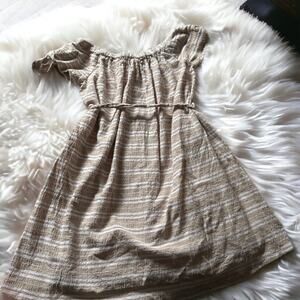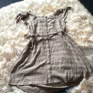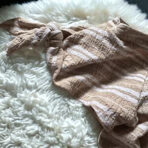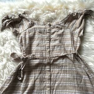 This off-the-shoulder, button front silhouette suits a day in the sun, especially when paired with wedges or espadrilles. Features beige and white striping, a belted fit, a button front, and bow ties around the sleeves.