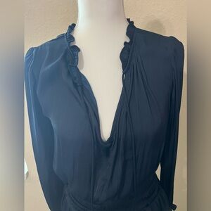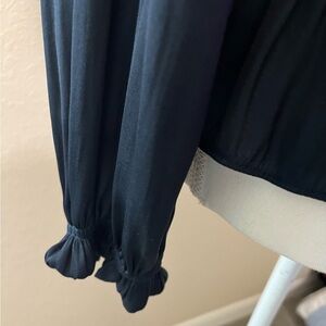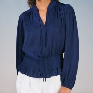 Anthropologie x Current Air Navy Satin Ruched Blouse.
