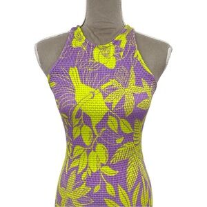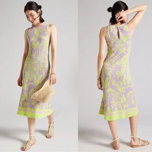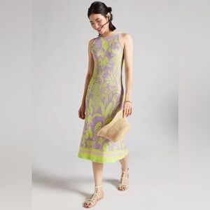 Sleeveless Midi Dress from Farm Rio for Anthropologie. Textured Knit Midi Purple & Neon Green with a tropical print. Midi length. Has a lot of stretch for that perfect fit. Whether you’re headed to a summer brunch, garden party, or vacation getaway, this standout piece brings effortless color and movement to every step.