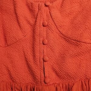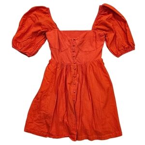 Maeve Sweetheart Mini Dress from Anthropologie. Color is a reddish orange. Sweetheart neckline with faux button front. Pull-on style with smocked back for the perfect fit. Puffed sleeves. Side pockets. Fully lined. Style 4130370060044. Sold out online.