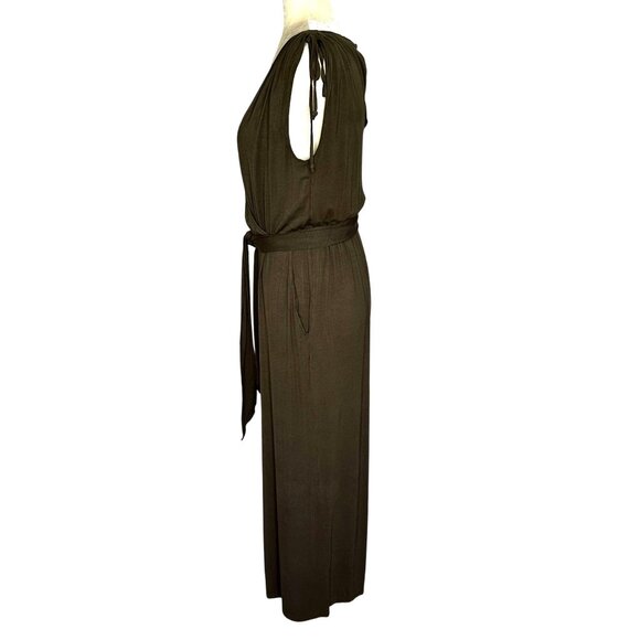 BRAND: Moulinette Soeurs STYLE: Alisande Jumpsuit FEATURES: Alisande knit jumpsuit in moss green. Wide-leg silhouette, deep V-neck, and tie waist detail. Perfect for effortless chic styling, casual wear, or transitional seasonal looks. CONDITION: Pre-owned, in excellent used condition. FABRIC: 94% Rayon, 6% Spandex SIZE: Small