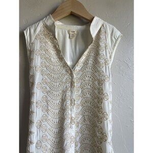 Anthropologie x TINY White Tan Embroidered Tie Waist Sleeveless Tunic Top Size XS Button Front Cotton Rayo Boho Bohemian