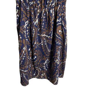 Step out in style with this elegant brown and blue patterned dress. Perfect for any occasion, this dress offers a flattering fit and a unique design. A must-have addition to your wardrobe.