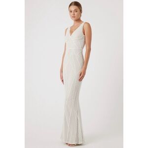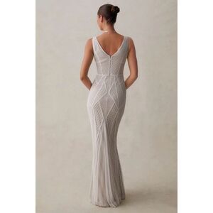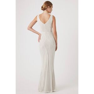 The floor-sweeping column Kylah gown from Rachel Gilbert displays intricate beading artfully arranged in a geometric design, accentuating the womanly silhouette cut with a plunging V-neckline mirrored by a low back.