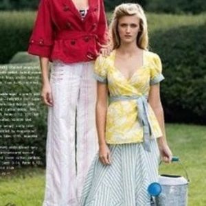 Anthropologie’s Odille Lambeth Palace Wrap marries romantic and modern with this cool grey and citrine color palette. This is such a lovely blouse to mix and match and play with.