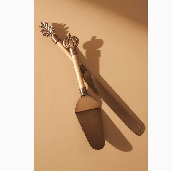 Anthropologie bronze colored pastry serving set featuring harvest-inspired figurines at its ends.