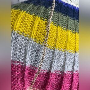 This pullover sweater has a relaxed fit. It has colorful stripes across the shoulder and gold metallic trim.