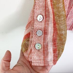 This beautiful orange, pink and khaki tan sleeveless tank is made from a lovely nubby linen blend that combines stripes, texture and breezy coolness. Scoop neck. Abalone shell buttons at the sides. Wear it casual with shorts and sandals or add statement earrings and wear it with pants for work/office/casual. NWOT. Please see photos for additional details. Pit to Pit 18“ Length 23“