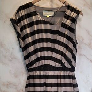 Anthropologie Leifsdottir Piano Grey/Black Stripe Asymmetrical Silk knee length Dress. Dress is 100% silk with a 100% polyester lining. Has pockets!