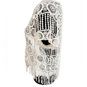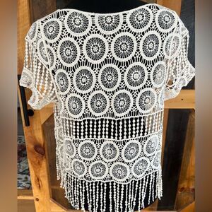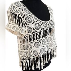 Anthropologie Dulcie cotton ivory crochet top with fringe. Medallion look with fringe at bottom, short sleeve with round neck. No size tag, but measurements are pit to pit 20”, length from shoulder approximately 31”. Super cute!!