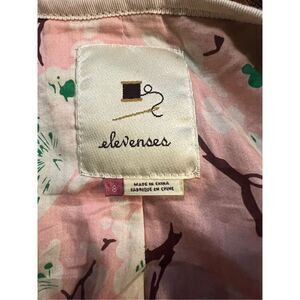 Super cute ruffled front zip front jacket from Anthropologie! This has a pink lining depicting cherry blossoms! There is white piping on the cuffs and down the placket as well as around the neck line. This is in very good preowned condition with no flaws noted. Polyester cotton blend to machine wash.