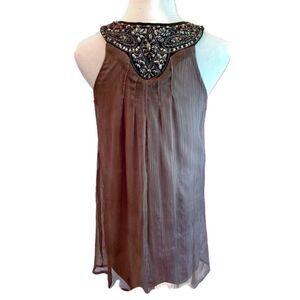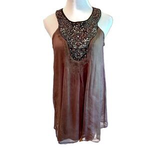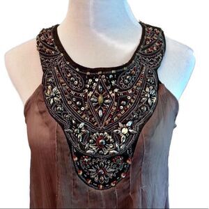 Epilogue by Anthropologie sleeveless babydoll dress with embellished neckline, fully lined and overall stretch. Bust 40” and length 34”.