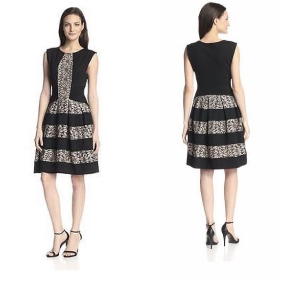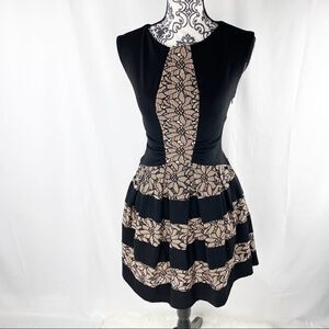Anthropologie Eva Franco Strata Lace fit and flare dress size 0. Black with tan floral lace accents. Crewneck with capped sleeves. Flared skirted bottom and discreet side zipper. Rayon/nylon material with stretch. No holes or stains. Beautiful on!
