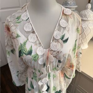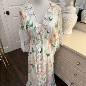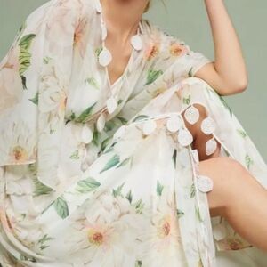Beautiful maxi dress by Farm Rio, and purchased at Anthropologie OK. This is in excellent condition. The only issue is in snap under the shoulder came off. It does not hinder the wear of the dress. It is shown in the pictures above.