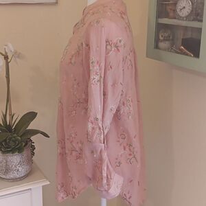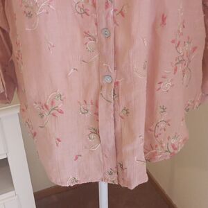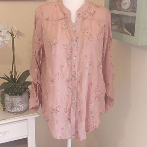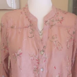 Chic pink blouse by Fig and Flower. Features delicate floral embroidery. Semi-sheer. Button up front, button cuffs. Size M measures 42 at chest, 42 at bottomhem. 29 long fromshoulderto curved bottomhem. Perfect for casual or dressy outings.