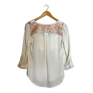 Anthropologie HD in Paris Cream Pink Sparkle Elinor Ruffle Long Sleeve Top. Features cream colored top with pink sparkle jacquard accents on back shoulders & buttons. Ruffle accents. Button closure. V-Neckline. Measurements in pictures.