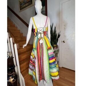A fabulous design by Hope For Flowers featuring a free-flowing silhouette and a striking print patterned from vibrant stripes. Hung delicately from thin straps and tied at the waist to create a form-fitting shape, it flows down into a voluminously light midi style that you can simply pair with your go-to heels for a bold summer ensemble.