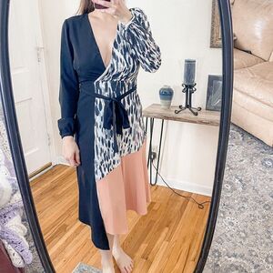 Features long sleeves with button cuffs, deep V neck with snap button closure, tie waist belt, hidden back zipper, lined, abstract watercolor print in a color block pattern