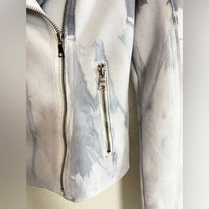Super soft and cozy faux suede combat jacket with an edgy yet feminine style. Cute with jeans or boho dresses. Has a tie dye graphic in gray with a ribbed moto sleeve. Ptp 20”, length 21”. Stretchy. Luke new condition. Designer Anthropologie brand. Questions? Leave a comment below!