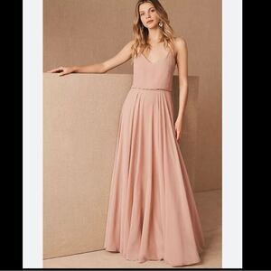 From Anthropologie, BHLDN Jenny Yoo blouson flowy chiffon gown in dusty pink mauve color. Lined. 100% polyester, flowing chiffon with back zip and spaghetti straps that form of V in the back. Measurements are approximate and taken while laying flat: 56 inches from shoulder to hem, 14 inches straight across the waist and 17.5 inches from armpit to armpit. In my opinion, this dress runs small, so I recommend double checking the measurements to ensure the proper fit for you.