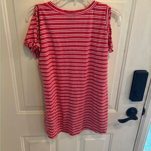 This Anthropologie t-shirt features a vibrant red and white color palette with a stylish tie front detail. Designed with short sleeves and a comfortable fit, it's perfect for casual outings. The lightweight fabric and classic crew neckline make it an ideal choice for warm weather.