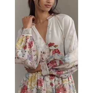 Polyester; cotton liningLong blouson sleevesV-necklineFitted waistButton frontHand washImportedLet Me BeCombining feminine details with timeless silhouettes, Let Me Be's dreamy collection is crafted from the finest of fabrics and embellished with handcrafted beadwork and embroidery.