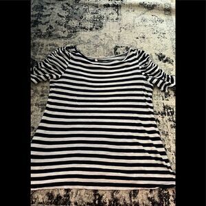 Good condition. Adorable Anthropologie Little Yellow Bird Blue/White Stripe Tee. Slub cotton. Rounded neckline with ruched sleeves. Size medium.